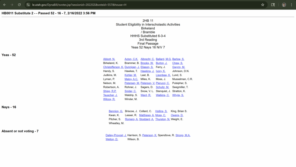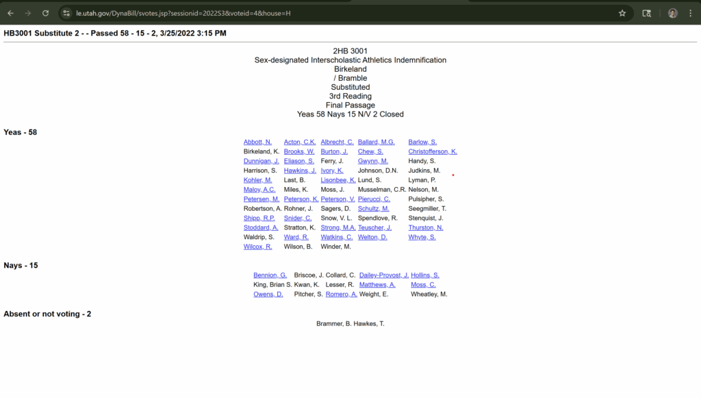 HB11 in 2022: This bill, which I cosponsored, banned males from playing in female sports in Utah middle and high schools. If you scroll down to line 6, you can see the list of cosponsors for yourself. I voted for this legislation when it was brought to the House Floor. The bill then went to the Senate and they held it until the last few hours of the annual legislative session. They then substituted in another bill with completely different language and which did not indemnify school districts if the ban was challenged in the courts–which we knew it would be. This meant that school districts would owe thousands upon thousands of dollars for upholding state law, which would give them a strong incentive to disobey the intent of the bill. The Senate then sent it back to the House for a final approval.